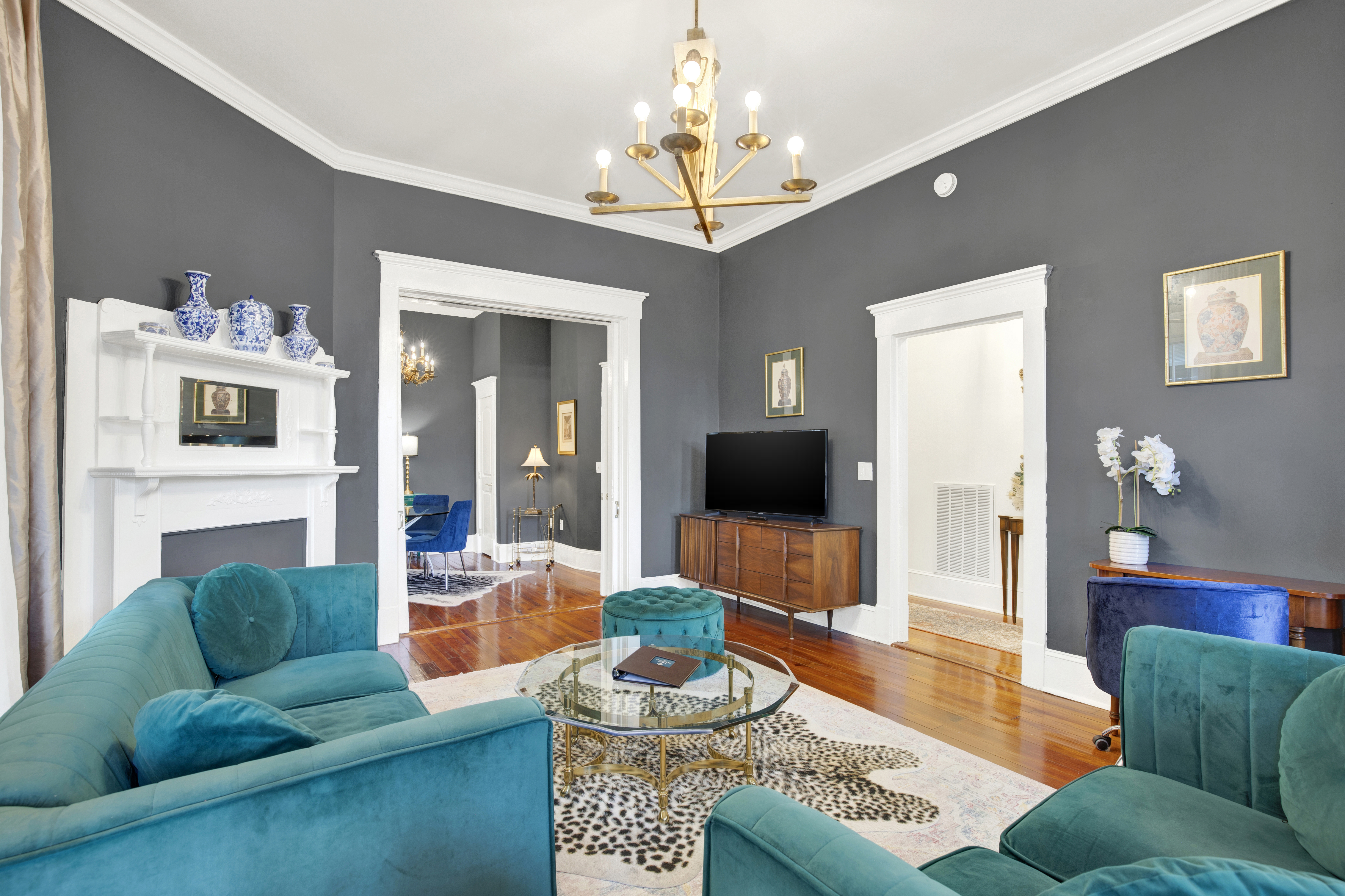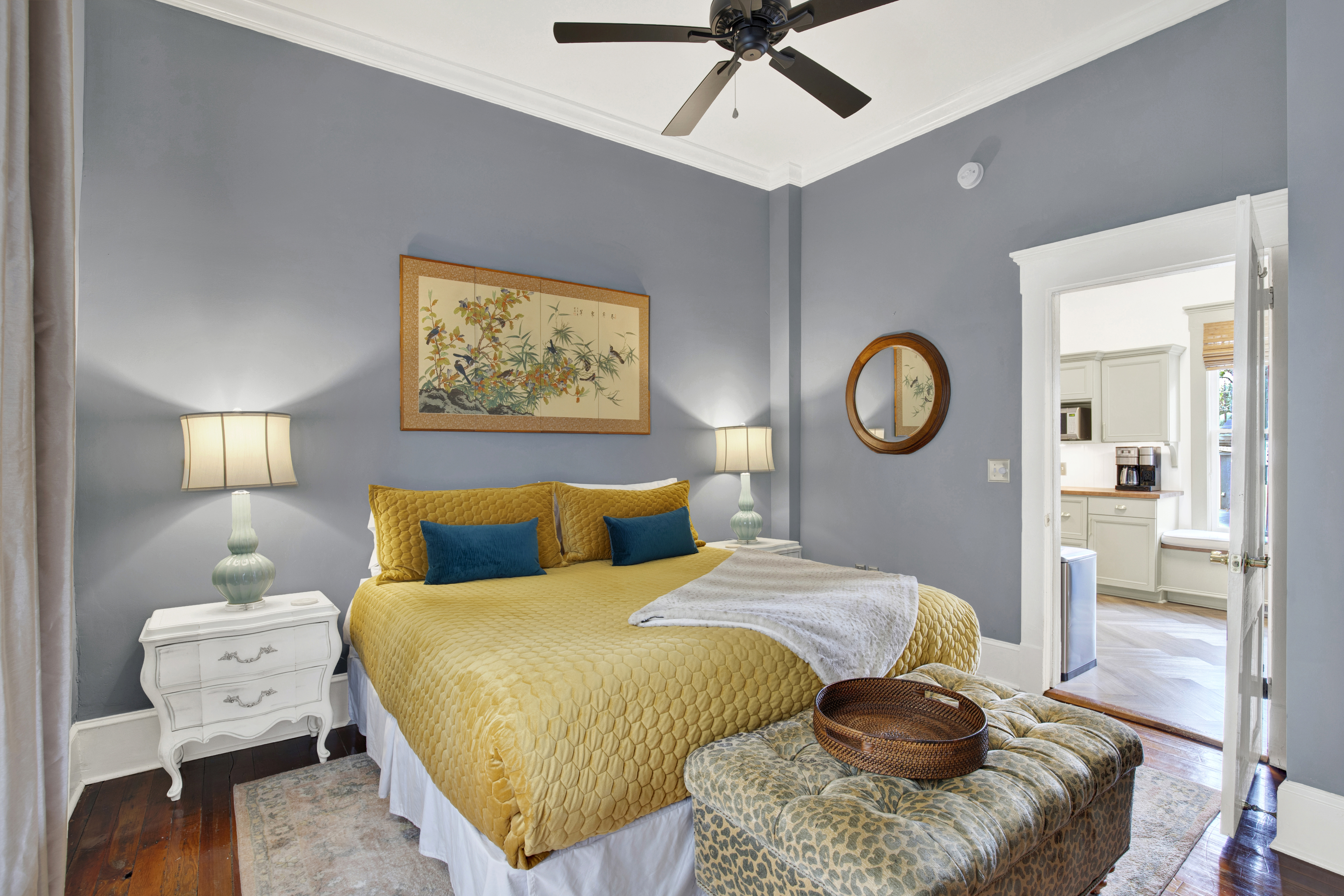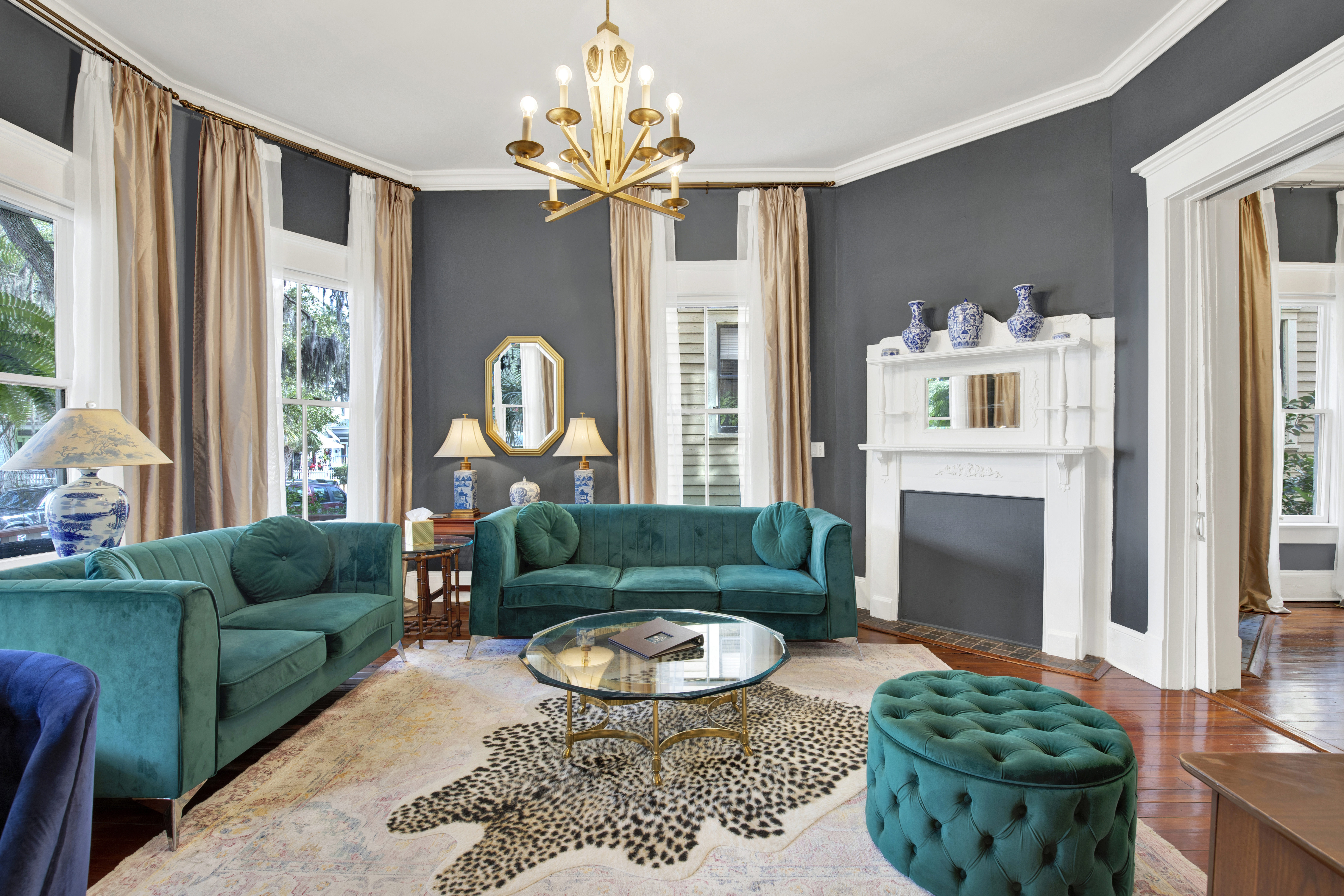 A dramatic parlor defined by deep tones, grand bay windows, and velvet seating sets the scene for timeless evenings in historic Savannah. Cook in the fully equipped chef’s kitchen and gather in the formal dining room. Two king bedrooms with plush linens offer refined comfort. A full bath with a vintage clawfoot tub brings historic character and a relaxing place to unwind. The private screened-in porch offers a comfortable space to relax day or night. Free street parking, keyless entry, a washer/dryer, and a dedicated workspace provide added convenience for both short visits and extended stays.