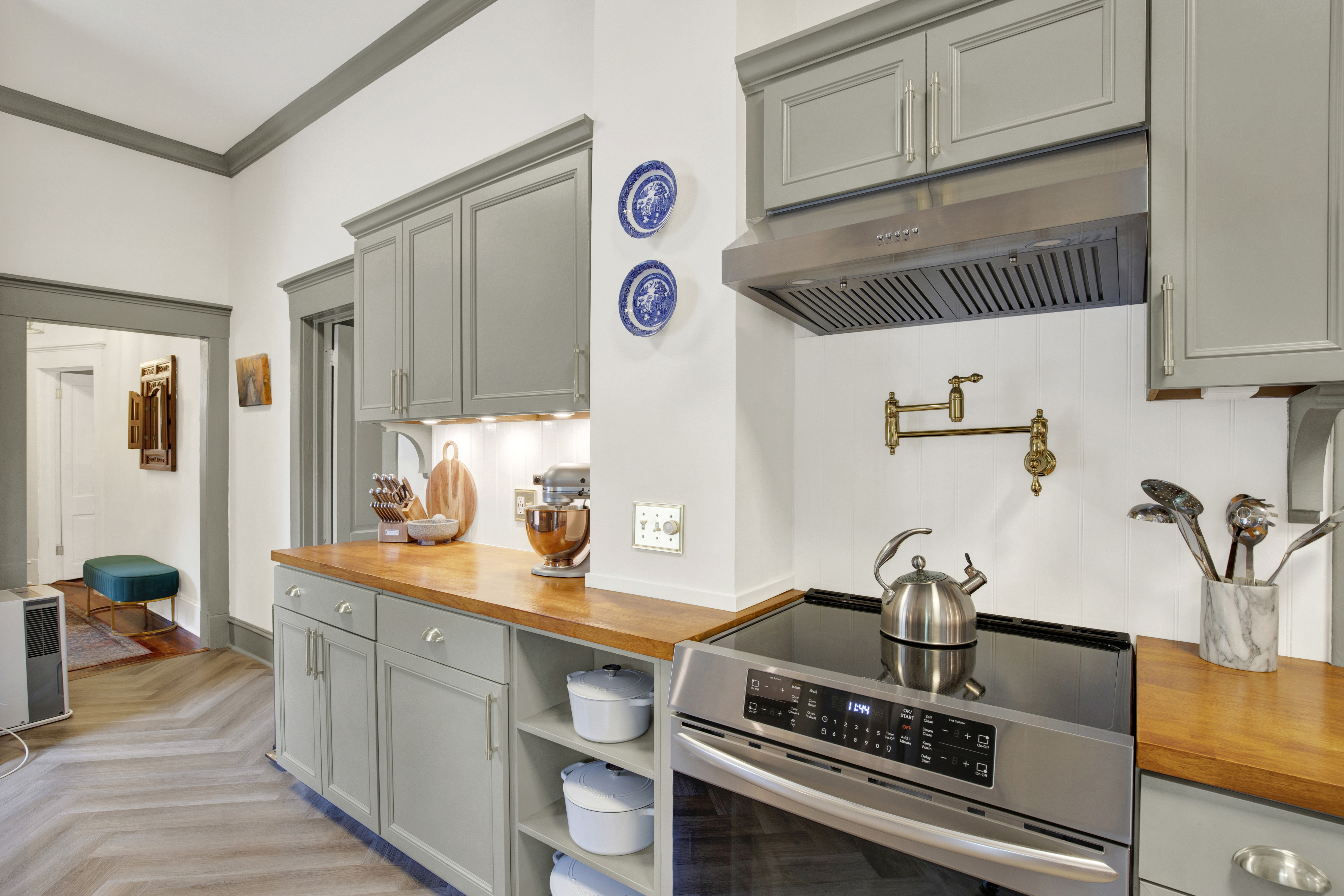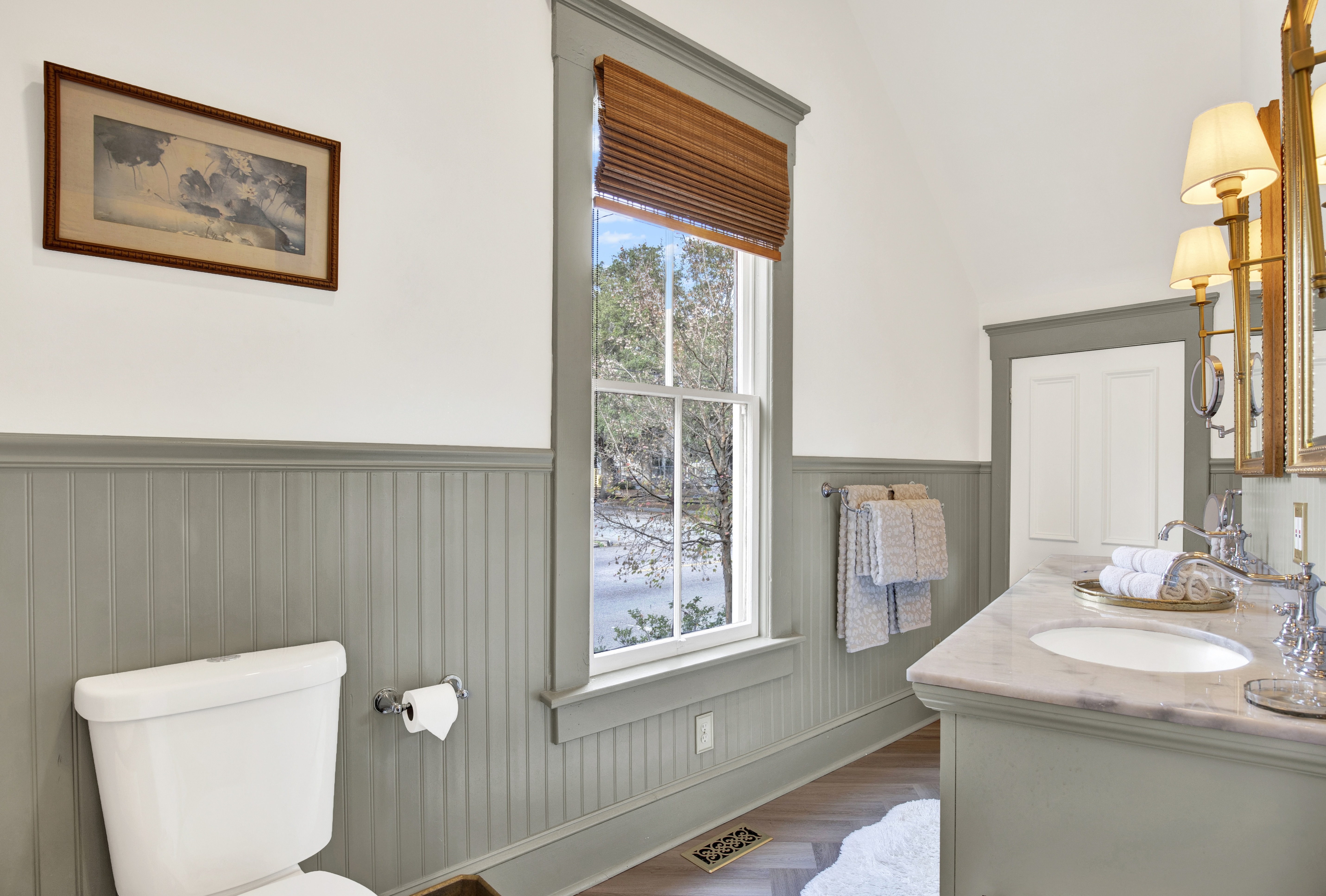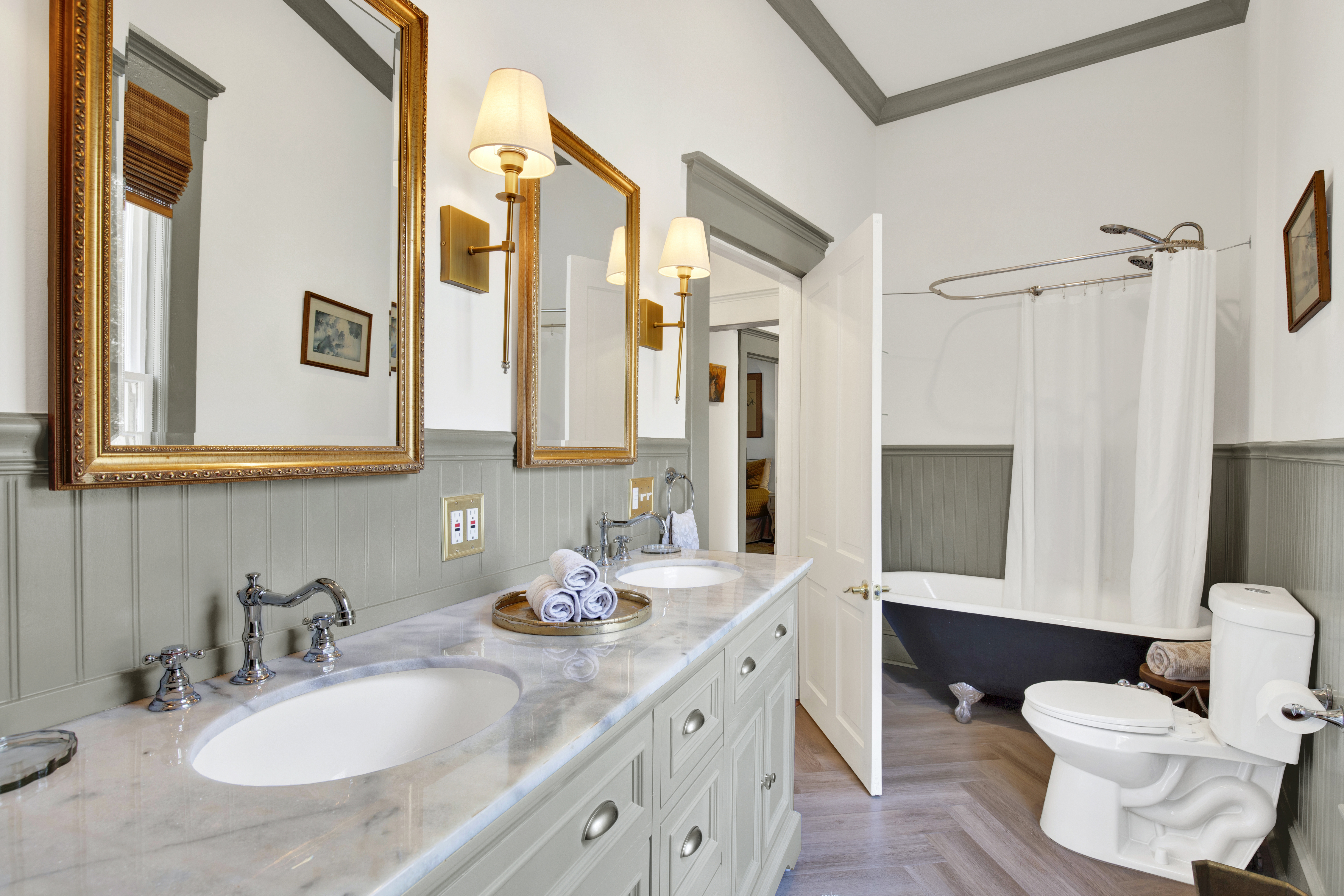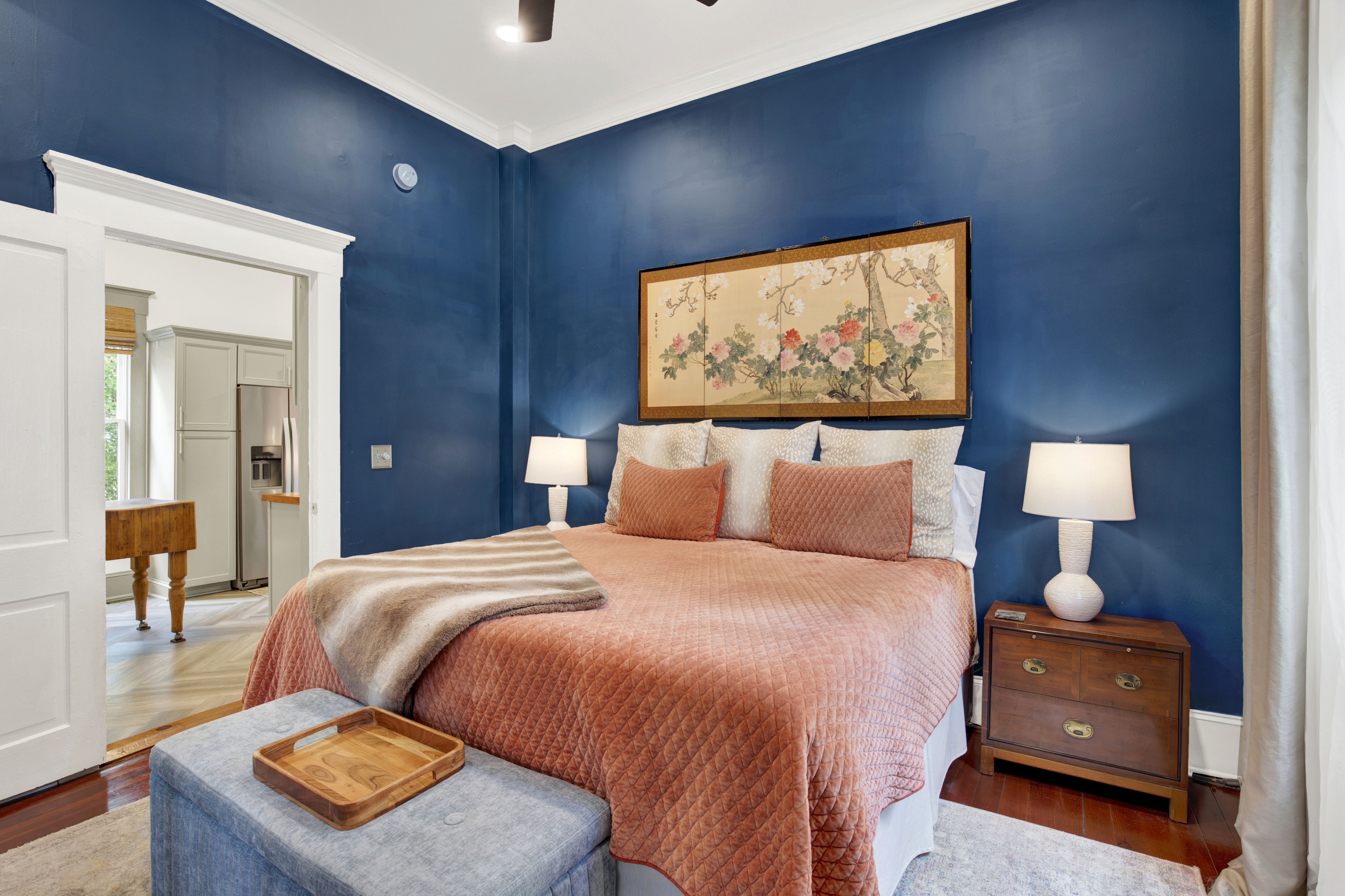 A dramatic parlor defined by deep tones, grand bay windows, and velvet seating sets the scene for timeless evenings in historic Savannah. Cook in the fully equipped chef’s kitchen and gather in the formal dining room. Two king bedrooms with plush linens offer refined comfort. A full bath with a vintage clawfoot tub brings historic character and a relaxing place to unwind. The private screened-in porch offers a comfortable space to relax day or night. Free street parking, keyless entry, a washer/dryer, and a dedicated workspace provide added convenience for both short visits and extended stays.
