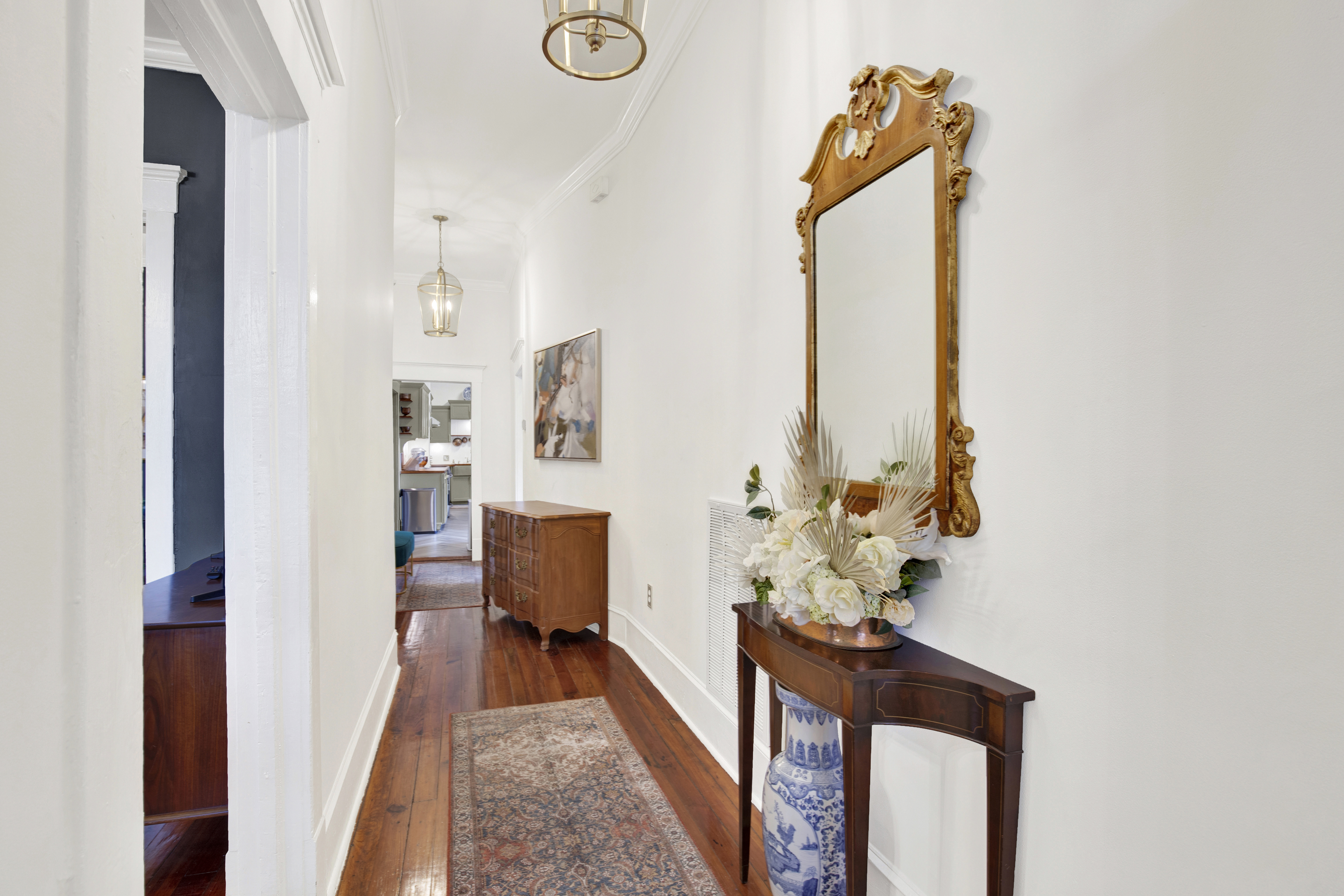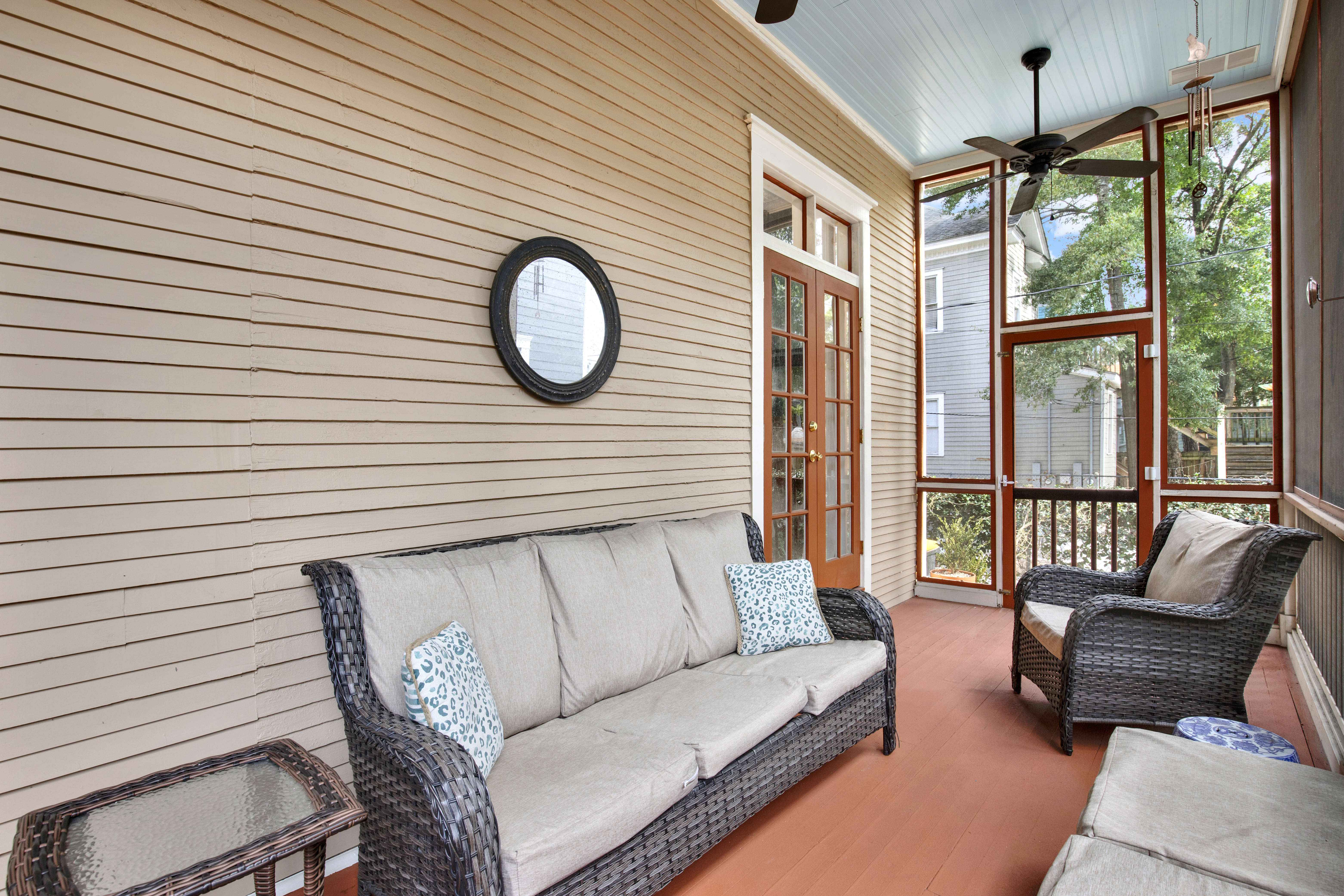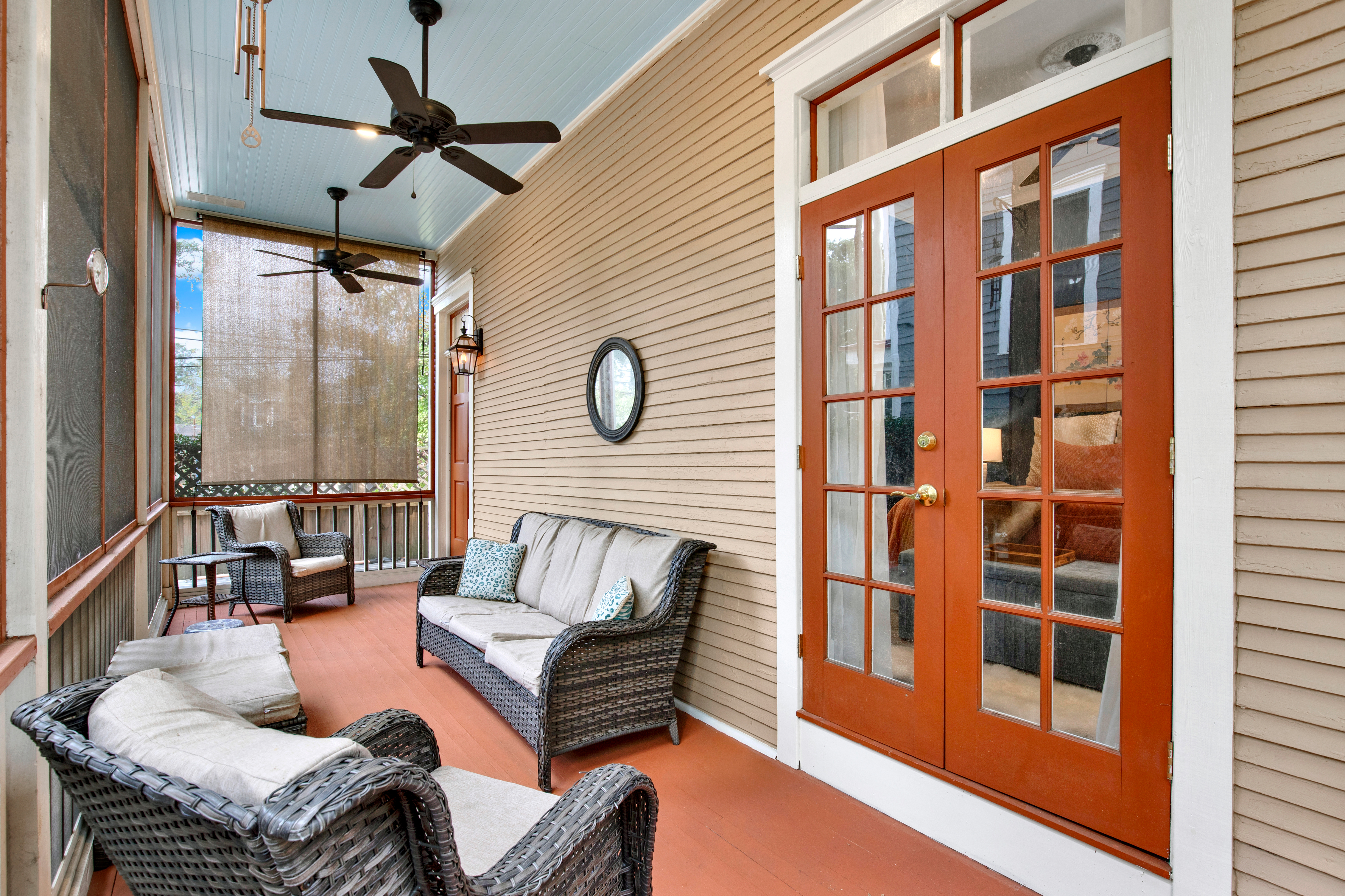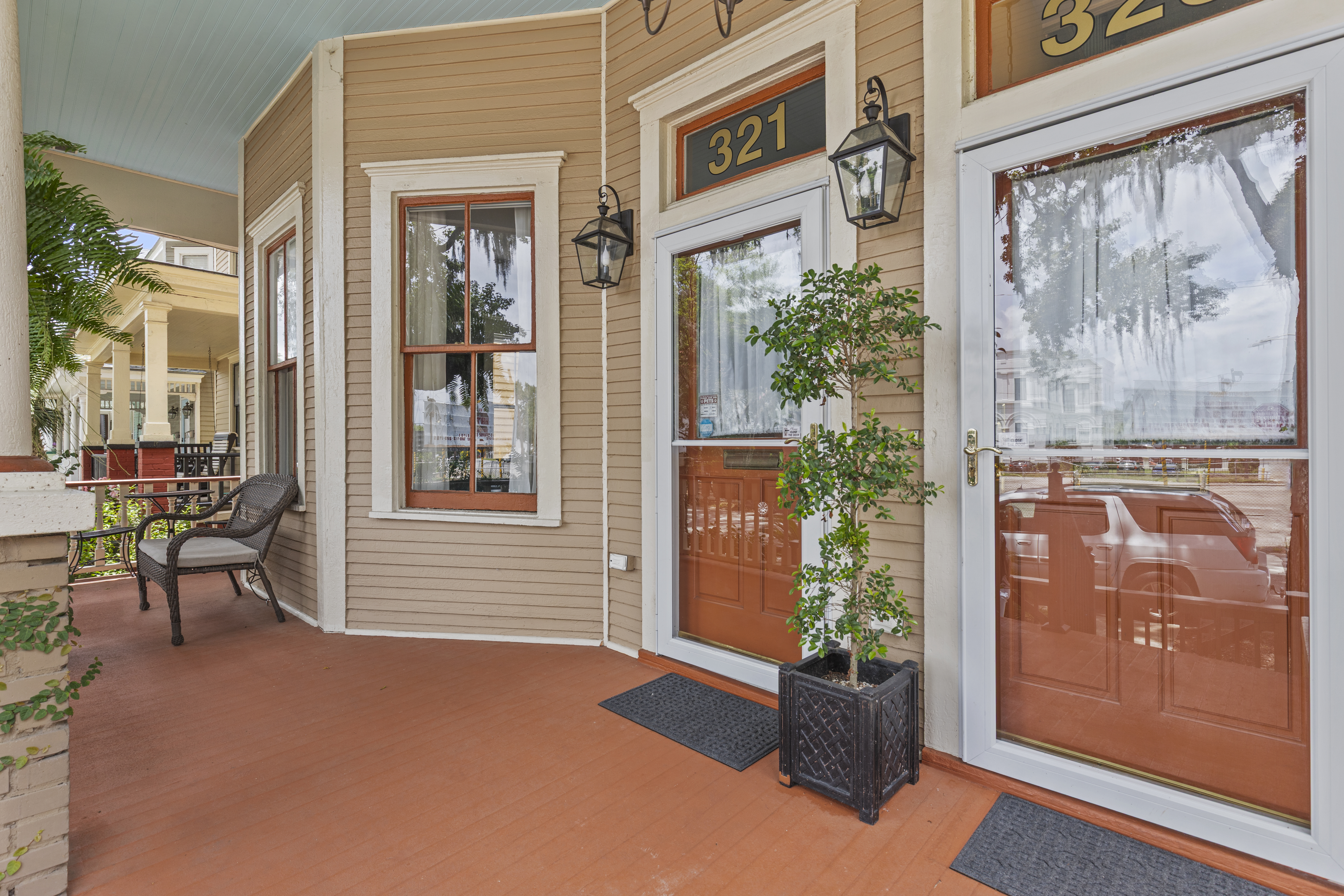 • Entire first-floor residence of a duplex • Occupancy: 6 • Private screened-in furnished porch • Secure keyless entry • Free on-street parking • Living room with smart TV • Fully equipped chef's kitchen • Formal dining room with seating for up to 4 • Bedroom 1: King bed, smart TV • Bedroom 2: King bed, smart TV • Queen air mattress for 5th and 6th guests • Full bathroom with vintage clawfoot tub/shower • Washer/dryer • Linens and towels professionally laundered and sanitized for every stay • Wi-Fi 1200+ Mbps • Smart TVs include Philo (70+ live cable channels) and access to personal streaming accounts • Tankless water heater delivering continuous on-demand hot water • Whole-house water filtration system providing purified water throughout the home